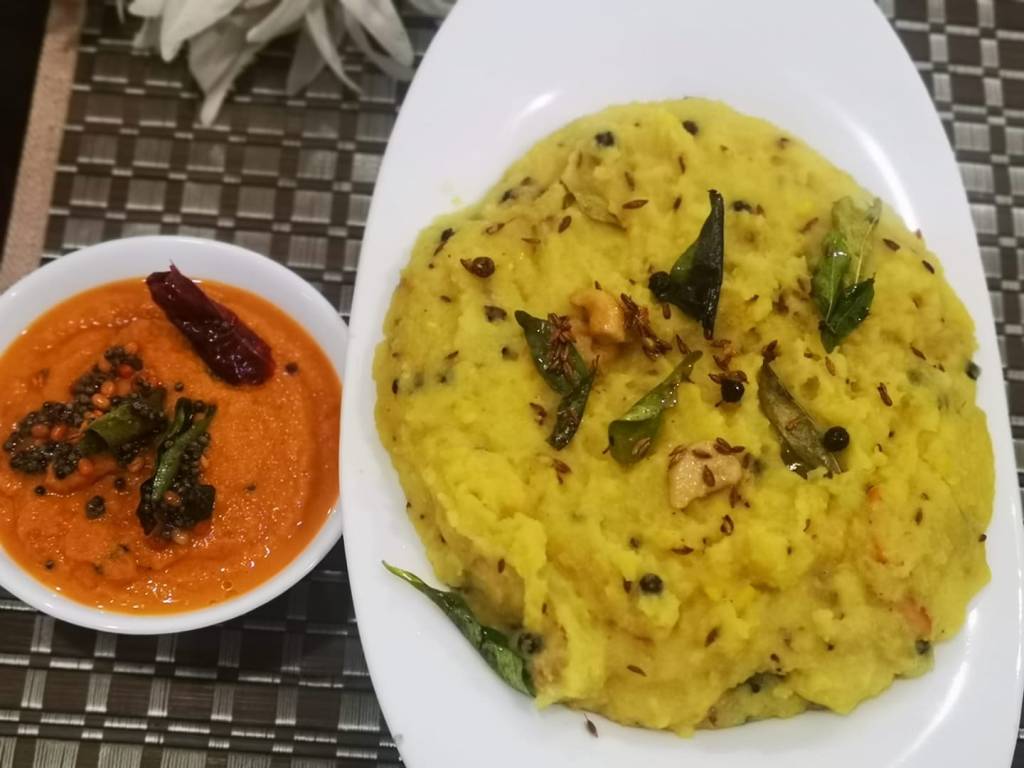 Roast the rava in a hot kadai until it is very slightly brown in colour (if the store bough rava is not a roasted one). Remove it from the pan and cool it. Though some people like to dry roast the moong dal, I prefer not to roast it. Boil the moong dal separately with 2 cups of water and a pinch of turmeric, until it is cooked. Do not overcook it. Heat kadai and add the seasonings and keep aside. In another pan, boil 3 cups of water. (Measure the water in which the moong dal has been boiled). Adjust the water accordingly. To the boiling water, add salt as per taste and add the rava and keep stirring to ensure lumps are not formed. Continue stirring for 2 minutes and then add the seasonings, stir it again and close and cook for another 2 minutes. Serve with spicy tomato chutney and add a little ghee before serving.
