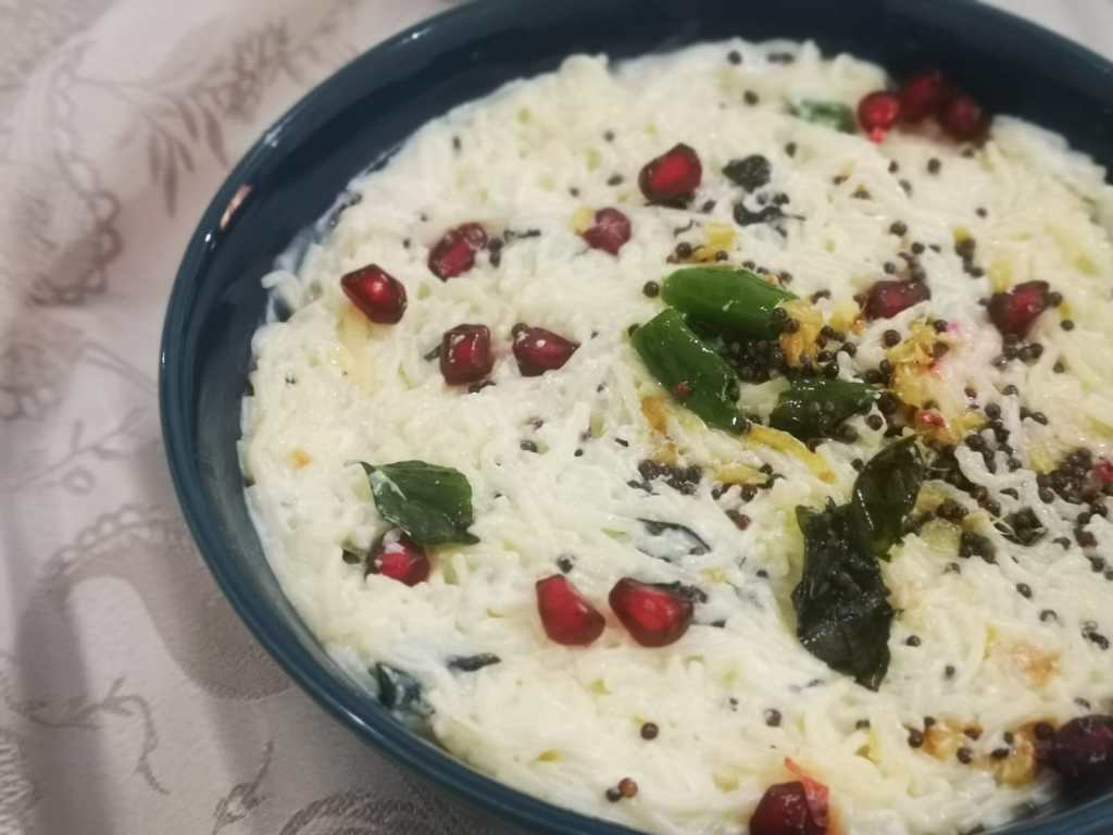 A South Indian meal is never complete without curd and rice at the end. Why not try a little variation and use vermicelli, also known as semiya instead of rice. It tastes great chilled and can be paired with any pickle or subji.