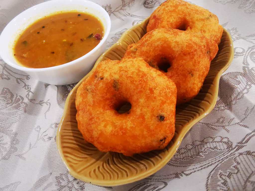 An authentic South Indian breakfast item ! No celebratory breakfast is complete without the awesome combination of idli, vada, pongal. It is a South Indian fritter, light and fluffy, shaped like a donut and made from udad dal lentils. Tastes good with sambar and coconut chutney.