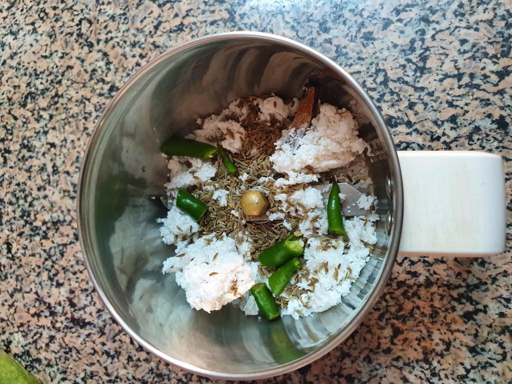 Grind the ingredients in “to grind” coarsely and add it to the red beans and pumpkin mixture and heat well once and stir.