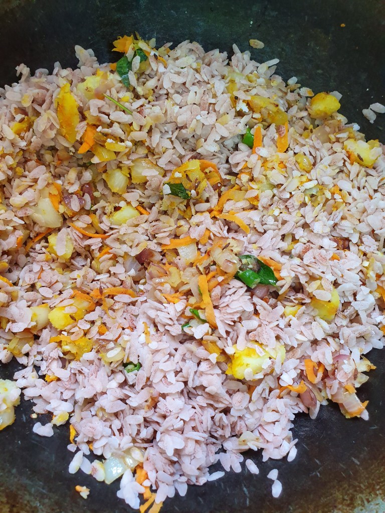 Stir it again and make sure it does not stick to the bottom of the pan. Once cooked, remove and add lime juice, coriander leaves, fried groundnuts and grated coconut.