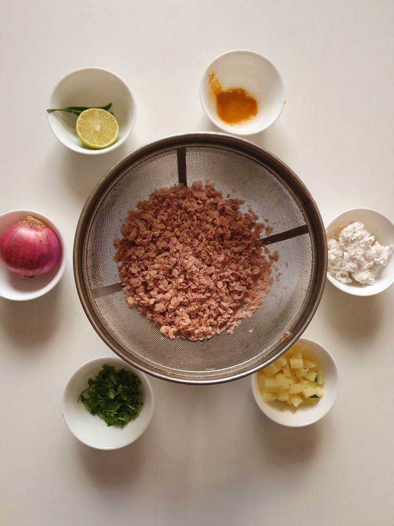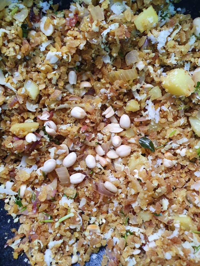 A popular Maharashtrian dish, it translates to onion, potatoes and rice flakes. It is one of my favourite breakfast options and we cook it often at home. The poha is spiced up with coconut, fried groundnuts, lime juice, coriander leaves and green chillies.
