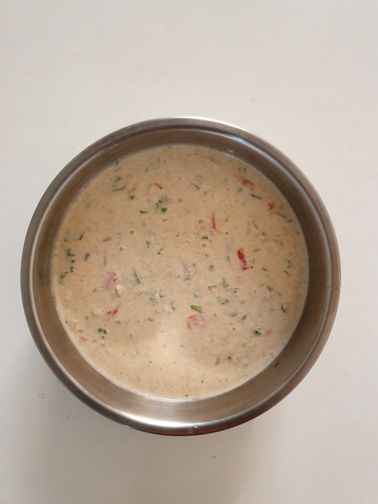 Note: If you keep the batter for a long time, the semolina will soak up all the water and the batter will become thick and soggy. Add buttermilk and water just before you begin to prepare the uthappams or savoury pancakes.