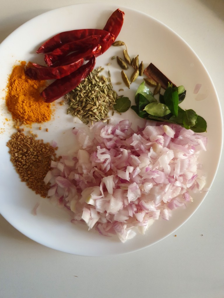 Heat a skillet. When it becomes hot, lower the flame and add the cardamon, aniseed, cinnamon and saute for a minute. Transfer these to a mixer and grind it to a fine powder. Transfer the powder to a small cup and keep it aside.