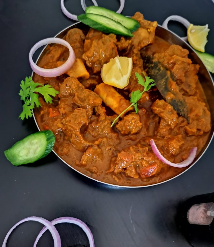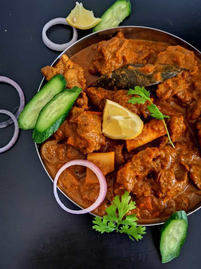 Ever since I had this at a Bengali friend’s place, the robust mixture of onions, tomatoes and spices with succulent pieces of meat tasted unique and quite different. This palate pleasing recipe is usually cooked with potatoes but I have not added it as I ran short of them. You can serve them with rotis or parathas or rice too.