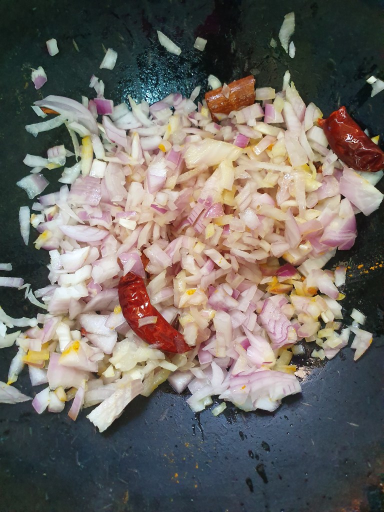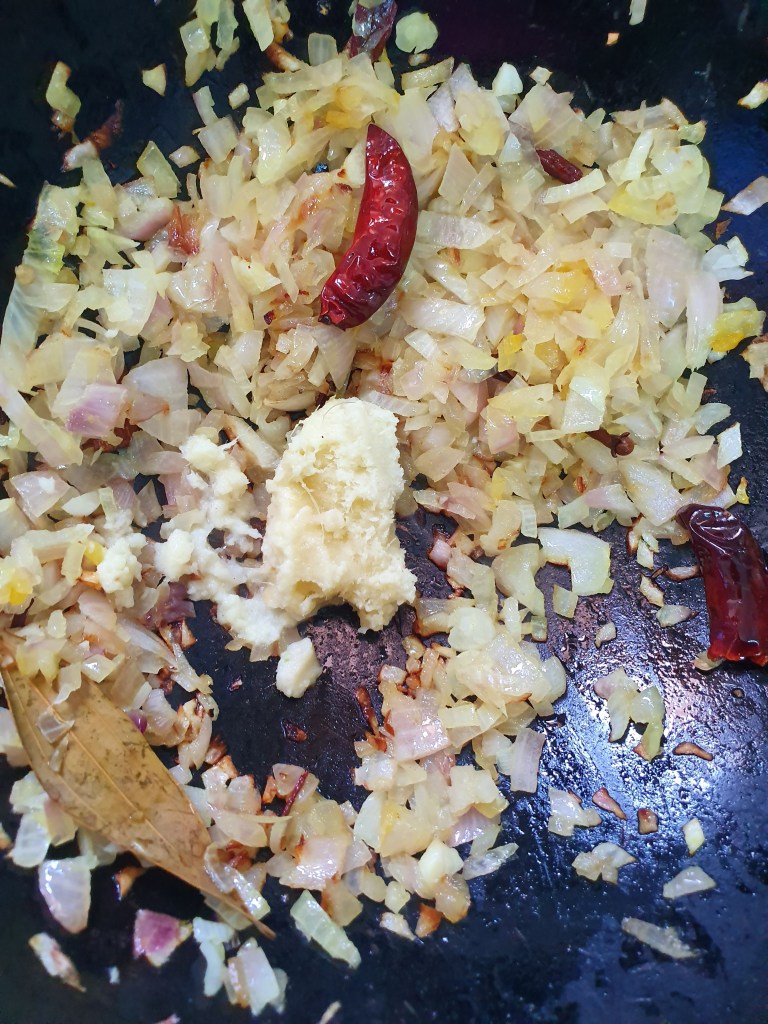 In the same pan, add bay leaf, cinnamon, cloves and red chillies. When it sizzles, add the finely chopped onion and saute for 3 to 4 minutes. Next, add the ginger garlic paste and saute until the raw smell disappears. Then, add the mutton pieces and saute again on high flame for 2 minutes.