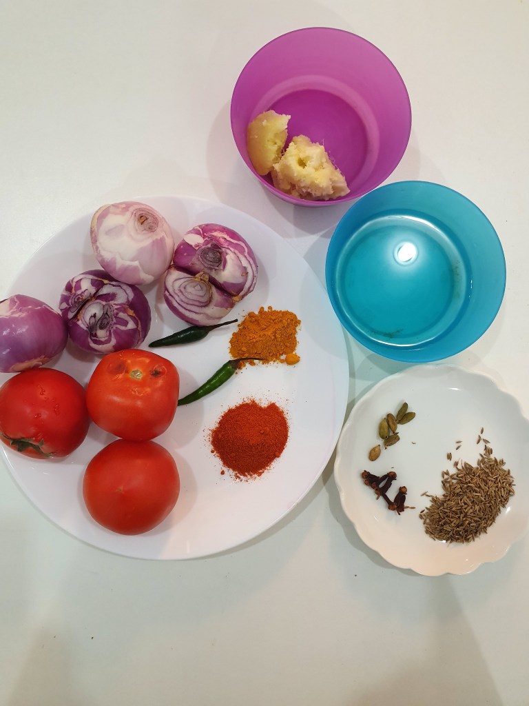 Cook covered for 5 minutes. Add the chopped tomatoes and cook again on low heat for another 5 minutes. Then, add the mint leaves, coriander leaves, garam masala powder, turmeric powder and saute well for 3 minutes. Add the strained vinegar from the onions and mix well. Cover and cook for 10 minutes adding 1/2 cup of water. When cooked, add cream and mix well.