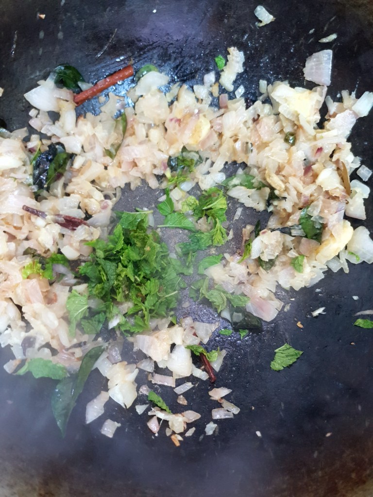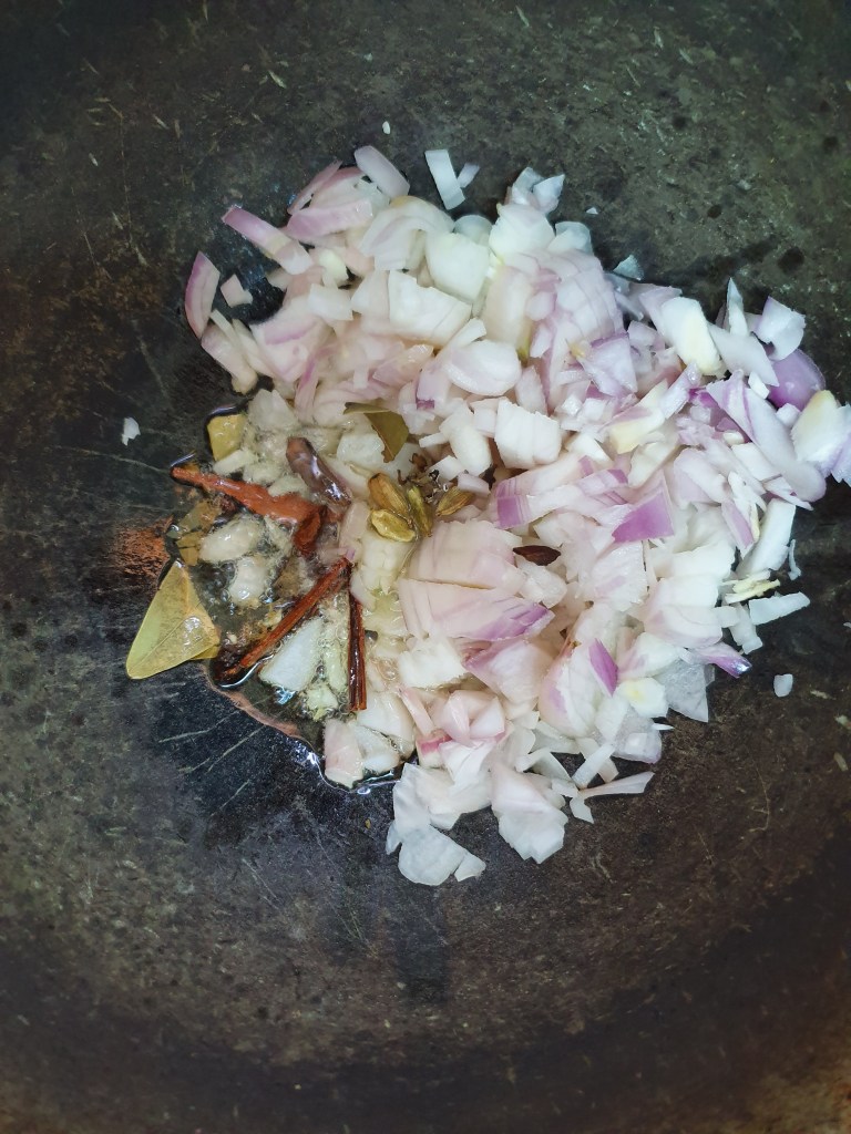 Heat oil in a pan. Add the jeera. When it starts to sizzle, add the cardomom, cinnamon and the bay leaves. When it turns slightly brown, add the finely chopped onions and saute well for 5 minutes. Soon, they will start to turn pink in colour. Then, add the curry leaves and the ginger garlic paste and saute till the raw smell goes away.