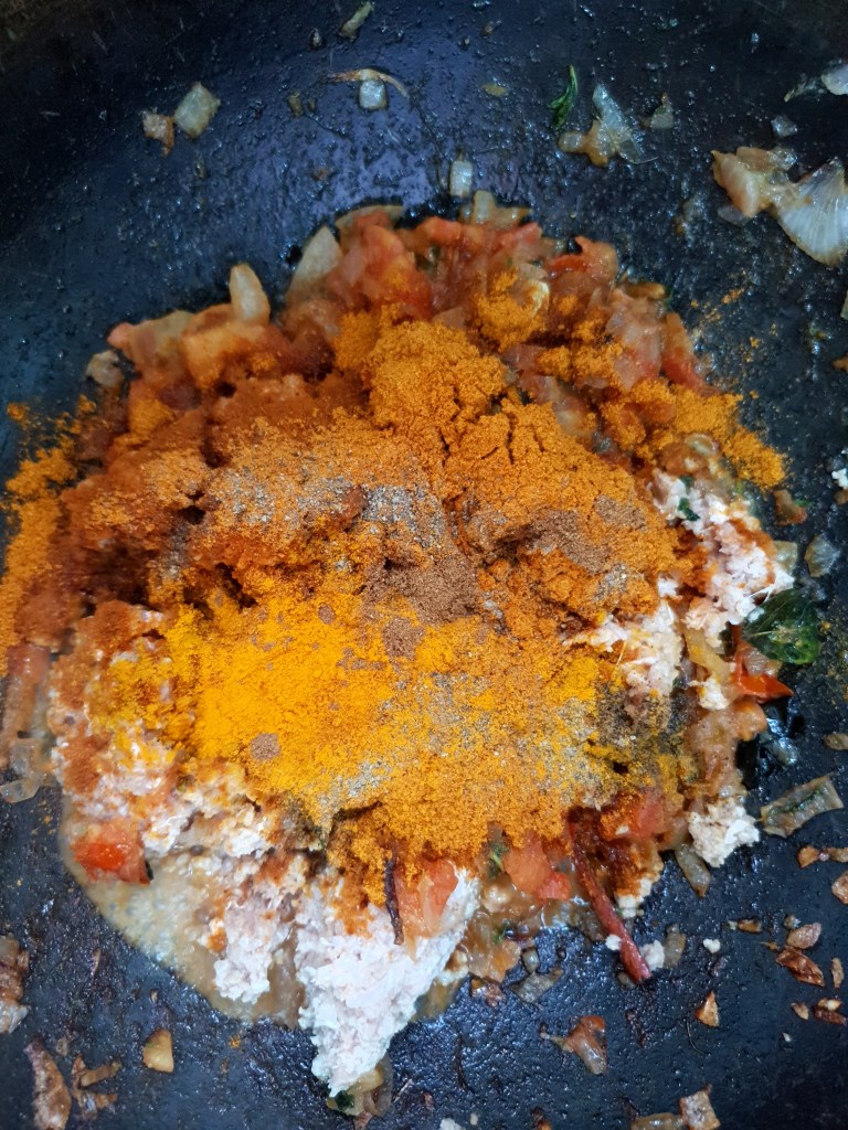 Next, add the coriander leaves and the mint leaves and stir fry for a minute and add tomatoes. Saute for another 5 minutes until the tomatoes turn pulpy. Now add the cleaned minced meat, turmeric powder, coriander powder, salt and the chillie powder and saute well for 5 minutes.