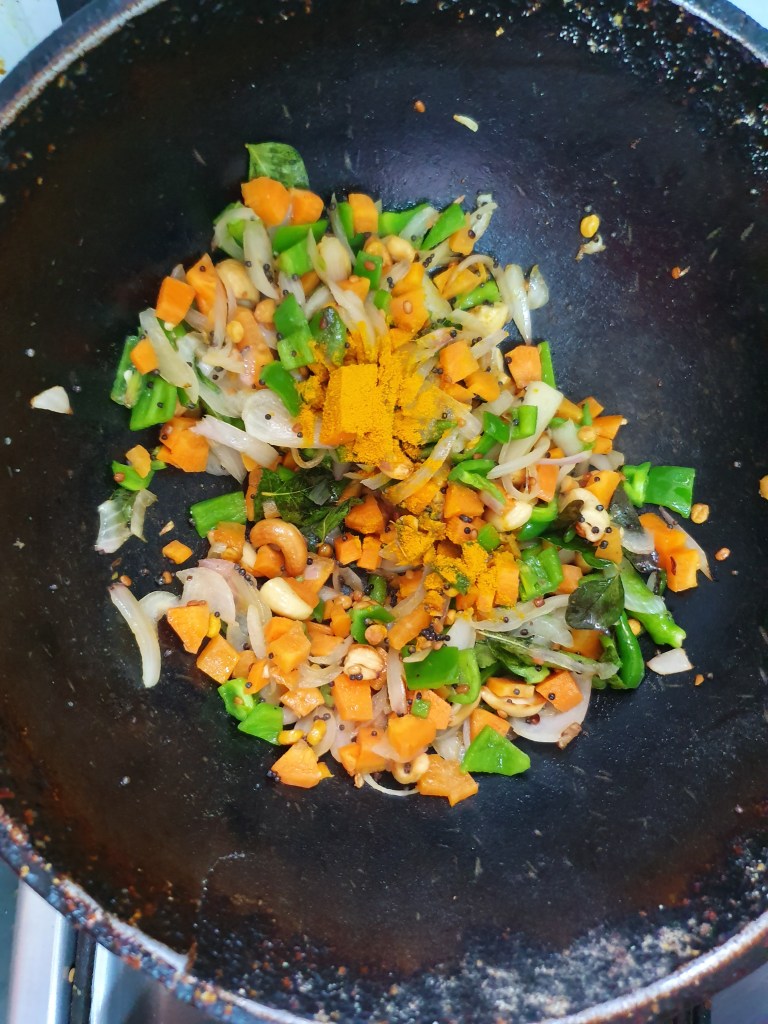 In the same pan, add oil and when it turns hot, add mustard. When it starts to sizzle, add bengal gram dal and udad dal to it. Reduce the flame to medium low. When it starts to slightly turn golden in colour, add cashewnuts, curry leaves and green chillies. Saute it for a minute and add sliced onions. Saute well and when it turns translucent, add the tomatoes. When it turns mushy, add the carrots, capsicum and peas and stir fry it on a medium flame.