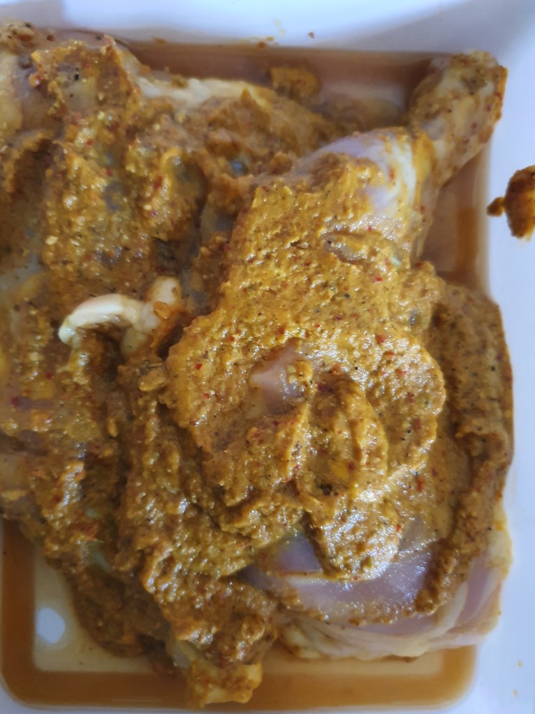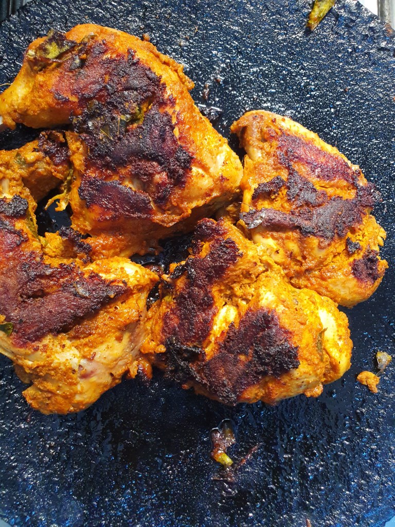 Cut the chicken into fairly big pieces and make slits on it. Grind the items listed under ‘ to grind’ and keep it aside. To it, add yogurt, salt and pepper powder. Mix well.