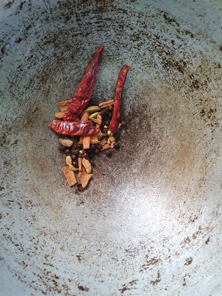 Slightly dry roast all the ingredients listed under “special dak bungalow spice” and grind into a fine powder.