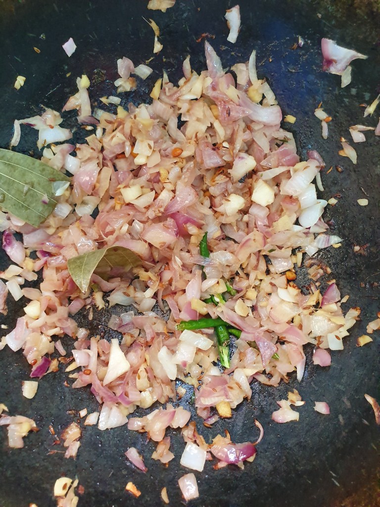 To the same oil, add cumin seeds and bay leaves. When they start to splutter, add onions and fry till translucent. Then, add chopped ginger, garlic, cumin powder, coriander powder, Kashmiri red chili powder and cook, stirring occasionally, until oil separates.