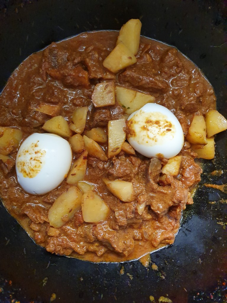 Carefully open the pressure cooker after letting the steam escape completely. And check if the meat has been cooked. Add the eggs and potatoes. Stir it well and adjust the seasonings. Serve with roti, parathas or pulao.