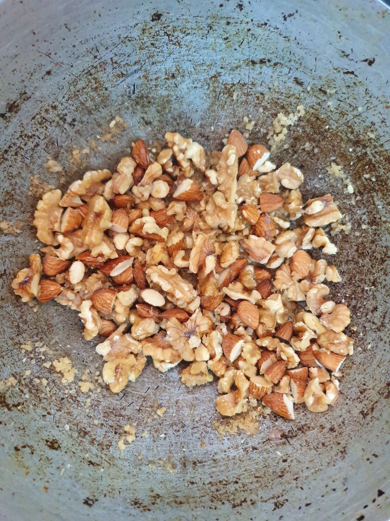 Once it is brown and starts sticking to the nuts, remove and spread on a plate.