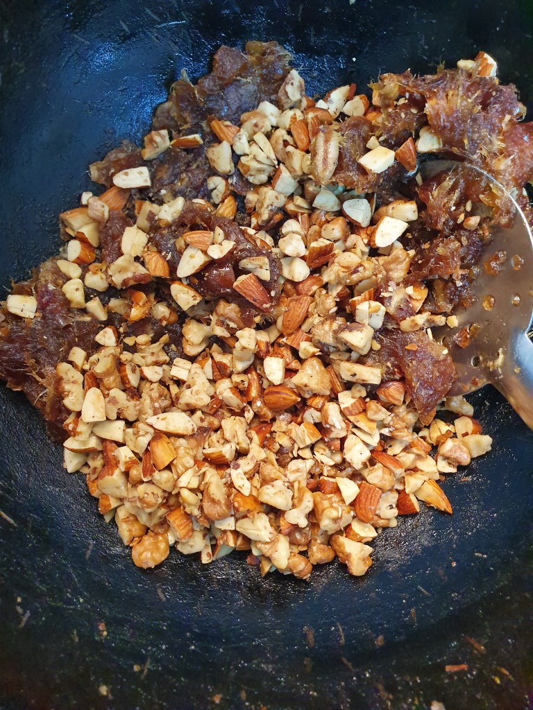 Add 3/4 tsp of ghee or butter and add the chopped pitted dates and saute well. When it starts to get mushy, add the fried nuts, vanilla essence, cardamom powder, salt and stir it well to combine.