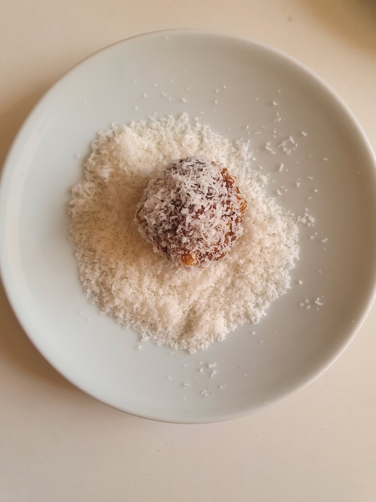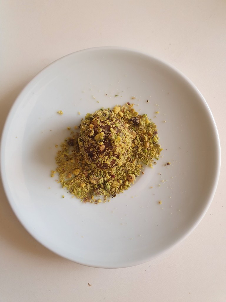 Take it off the pan and when it turns slightly cool, roll them into balls. Coat the balls in powdered pistachios or cocoa powder or dried shredded coconut or flax seeds.