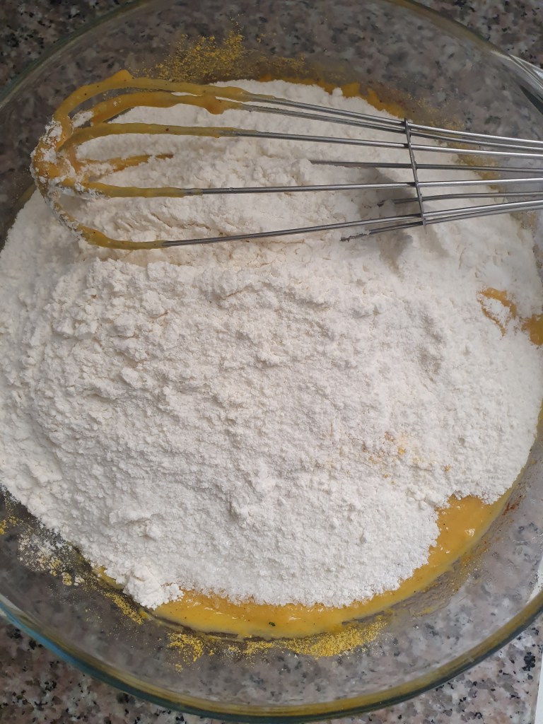 In a mixing bowl, whisk flour and baking powder and keep aside.