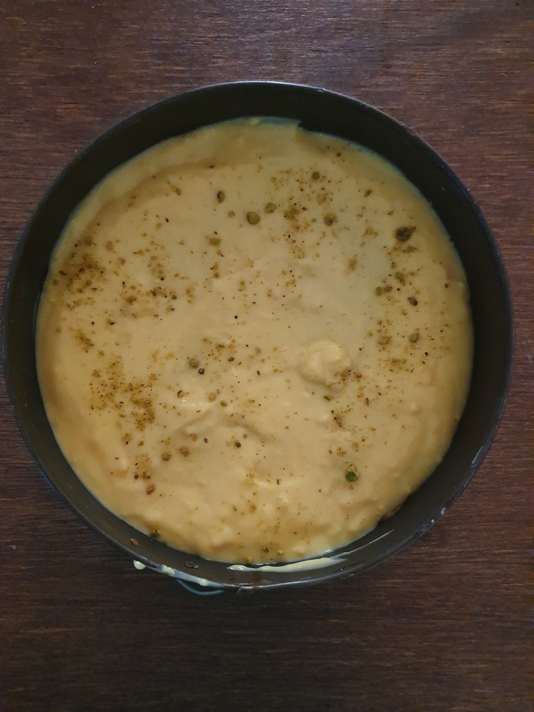 Take out the custard mix and spread it evenly in the tart pan or cake pan. Keep it in the fridge for an hour or two and when set, garnish it with pistachio powder and mango slices.