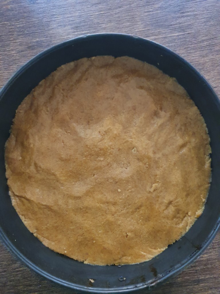 First, powder the biscuit in a mixer jar or blender. Add the melted butter to it and mix well. Take a tart pan or a detachable cake pan and grease it with butter slightly. Add the biscuit crumb mixture to it and spread it evenly around the pan. Place the pan in the fridge for 30 minutes till it sets.
