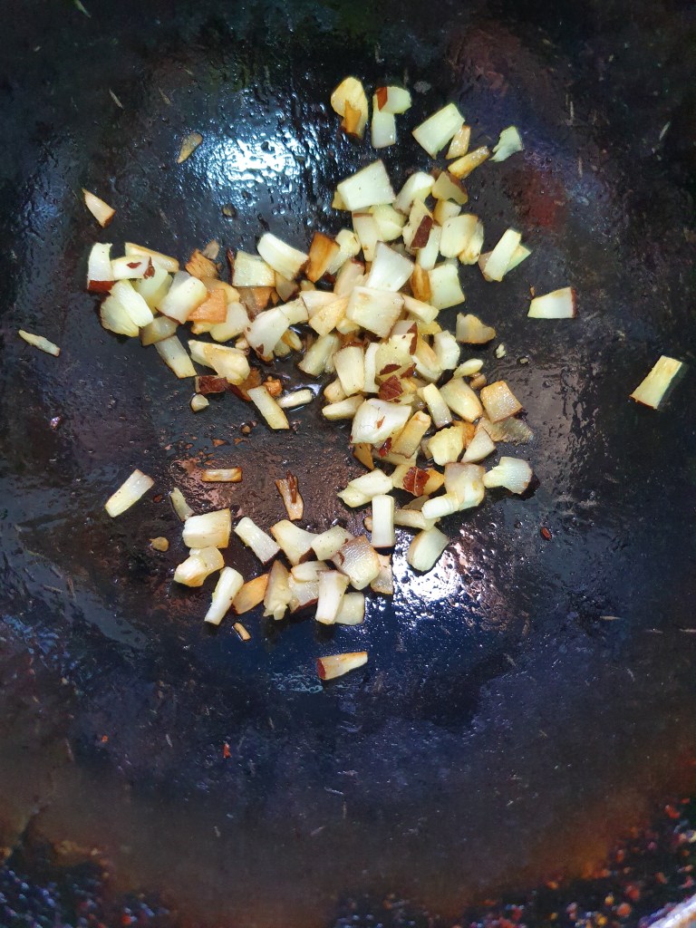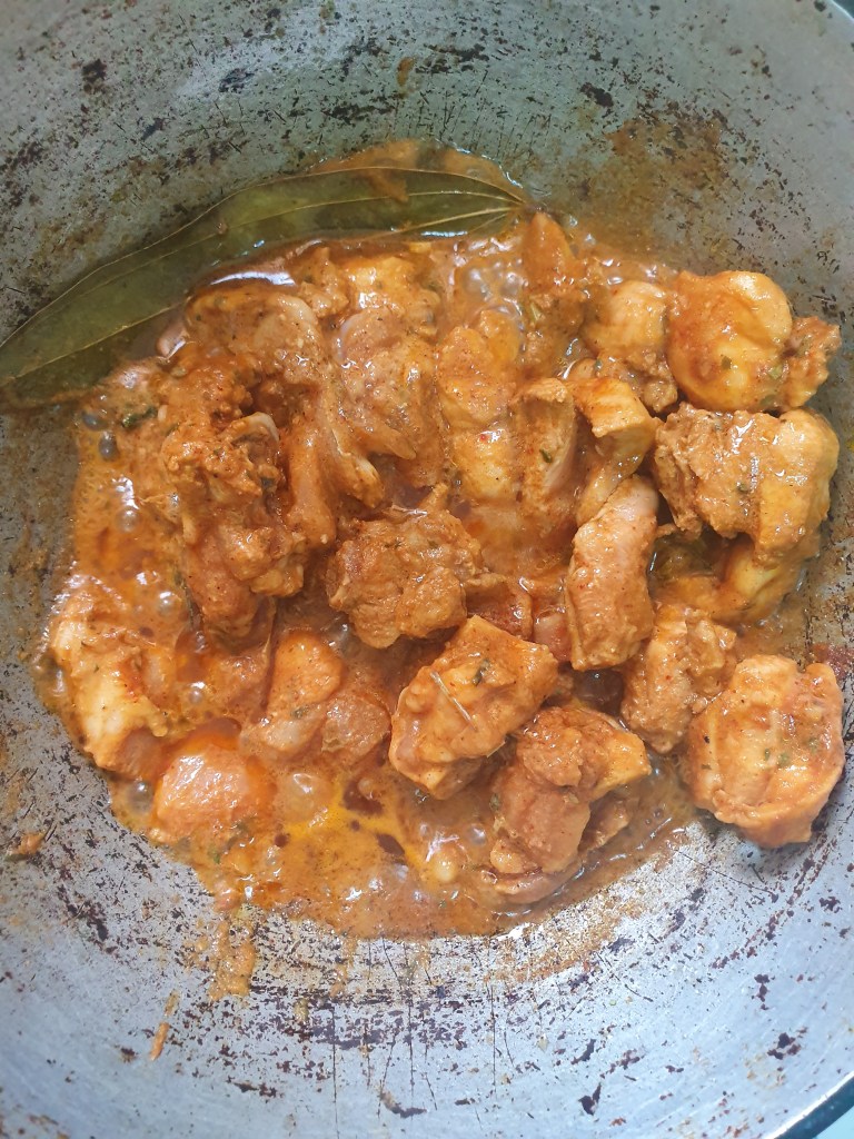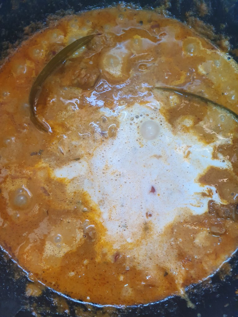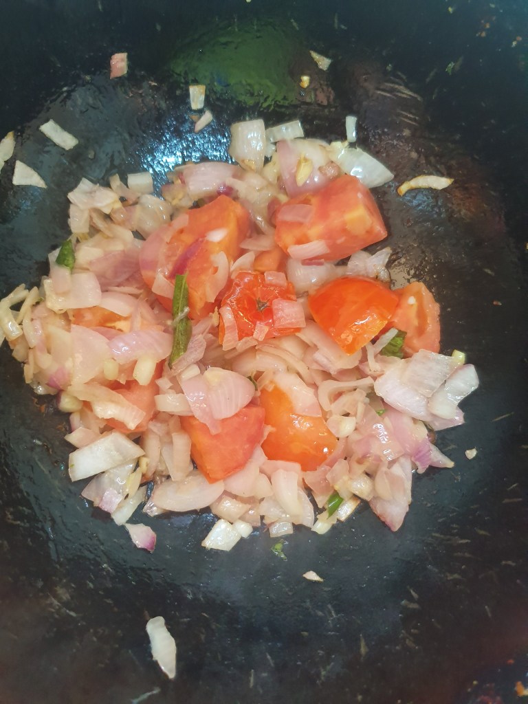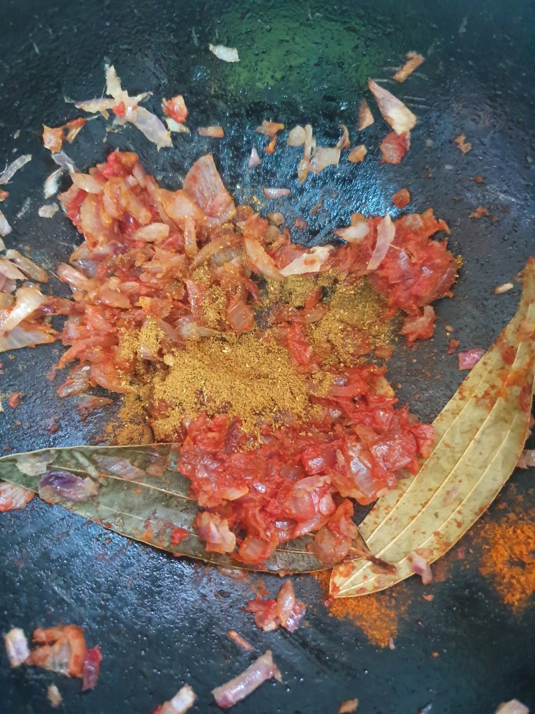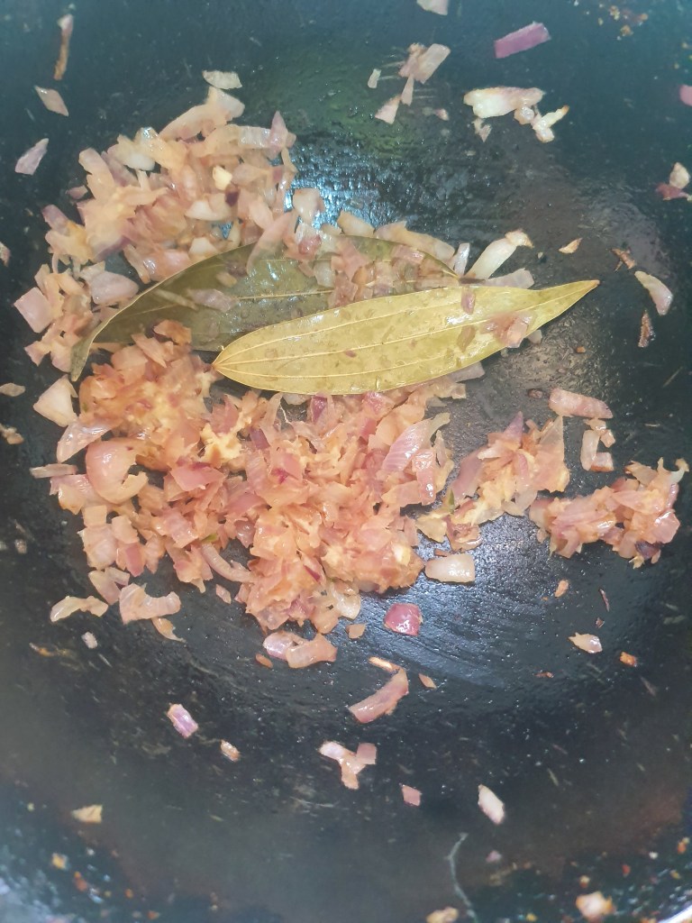 In a pan, heat oil. Once the oil is hot, add all the whole spices- bay leaves, cardamom pods, and cinnamon sticks. Once the spices have released their aromas, add the sliced onions and saute well. When the onions have turned slightly brown in colour, add the ginger garlic paste and saute for 3 – 4 minutes until the raw smell dissappears.