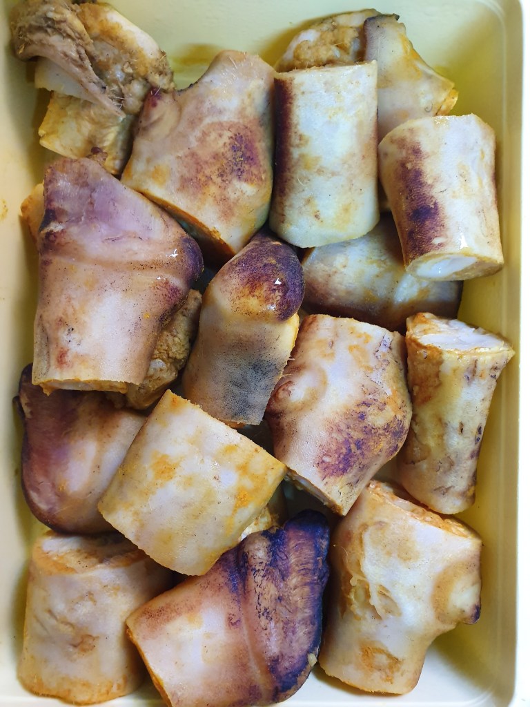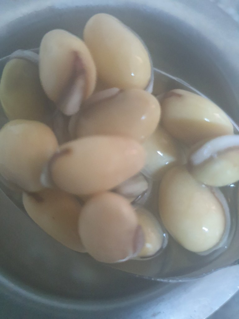Wash the colocasia well. Take off the skin and cut each one into 2 to 3 pieces and boil it separately in water. Cook until done and discard the water.