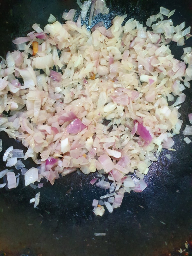 Finely chop onions, dice the potatoes and tomatoes. Keep it aside. Marinate the prawns with 1/4 tsp turmeric and a little salt and keep it aside for 10 – 15 minutes.